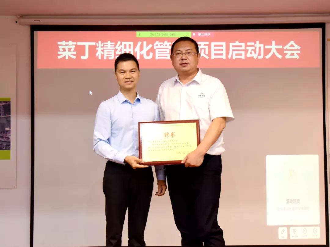 在启动大会上,黄经胜董事长亲自向高胜咨询公司丁佰胜老师颁发聘书,拉开了菜丁集团与高胜咨询公司合作的帷幕。为切实推动精细化管理项目进程,菜丁集团总裁李毅、副总裁钟丽慧亲自为项目成员颁发任命书,项目组将从战略规模、标杆农贸市场、规范管理体系、人才培养等方面进行系统升级工作。