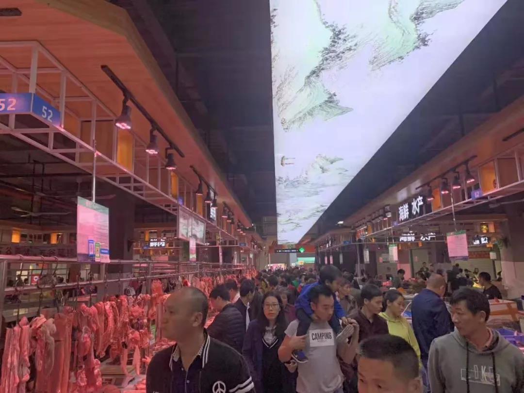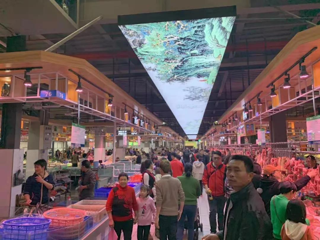 升级改造后的菜丁·兴华市场宽敞明亮,空气清新,环境整洁靓丽。菜丁设计团队还精心设计了山水画卷的天幕,一进去,仿佛进了一个豪华的购物中心。在市场的一角,还设有农耕文化橱窗,大大增强了街市的文化底蕴。