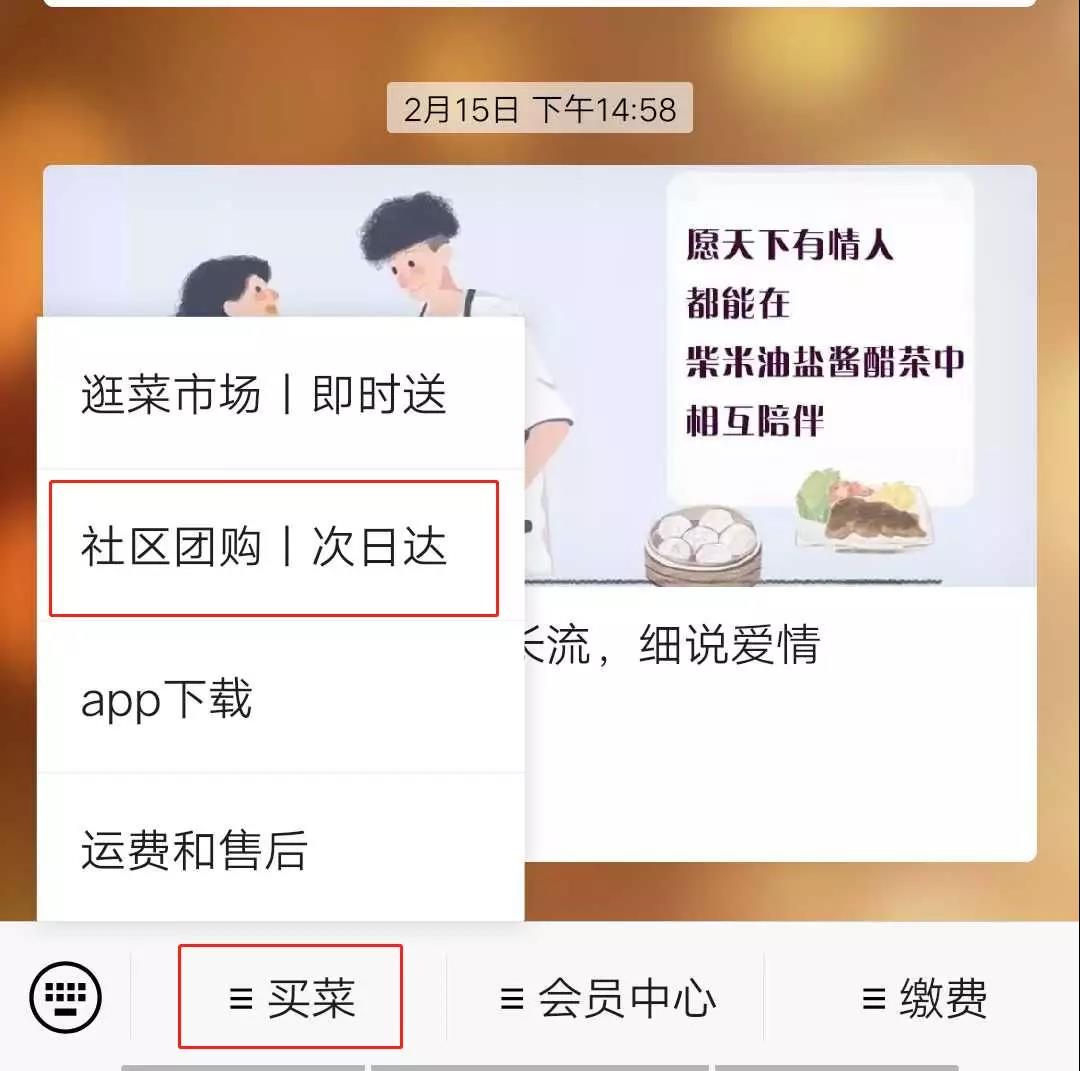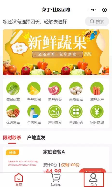 进入菜丁公众号后,点击下方“买菜-社区团购 | 次日达”。进入小程序,点击右下角我的-选择团长-选择最近提货点。
