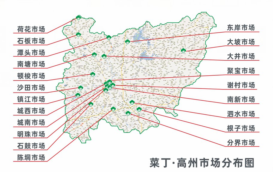 现时,菜丁正在对高州市市场物业管理中心属下的泗水市场、分界市场、根子市场、石鼓市场、顿梭市场、沙田市场、镇江市场、石板市场、南塘市场、荷花市场、大井市场、东岸市场、潭头市场、城西市场、城南市场、明珠市场、聚宝市场、南新市场、谢村市场、陈垌市场、大坡市场共21个农贸市场进行分批改造,计划于2020年12月份全部完成。