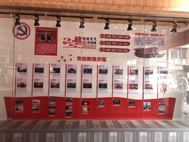 图:红色文化墙,党建宣传氛围浓厚,培养市民爱党爱国情怀。