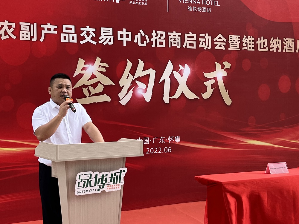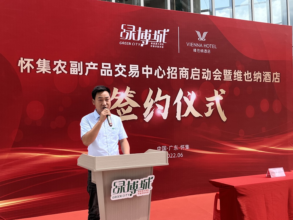 肇庆怀集绿博城商业发展有限公司副总经理张杰胜发表致辞,对双方携手发展表示热烈祝贺,并表示,绿博城项目经过两年多的建设筹备,将于今年下半年正式开业运营,此次引进维也纳酒店,是绿博城全面开启打造园区宜商宜业环境的先行举措,双方将聚焦怀集产业客商往来,不断优化农产休闲商务配套,打造贴心便民服务圈,助推怀集农产品交易环境高质量发展。