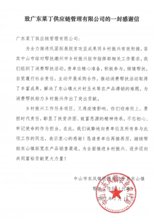 “你们迎难而上,勇担时代责任,彰显了扶贫济困、致富思源的精神传承,不忘初心、牢记使命的作为担当……”近日,菜丁供应链公司收到了这样一封感谢信,其言辞间情真意切、鼓舞人心,那么,具体是怎么回事呢?
