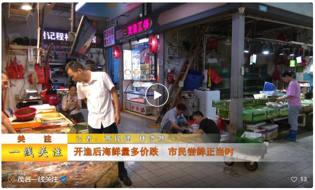 近日,记者在茂名市区菜丁·河东市场海鲜档见到,开渔后各种新鲜的海虾、螃蟹、带鱼、马鲛鱼等水产品大量上市,海鲜品种繁多,过来购买海鲜的市民比之前多了不少,交易呈现购销两旺。有档主告诉记者,随着休渔期结束,海鲜供应量增多,价格有不同程度的降幅,海鱼类价格较休渔期整体下降了几元到三十几元不等,有些甚至降价一半。